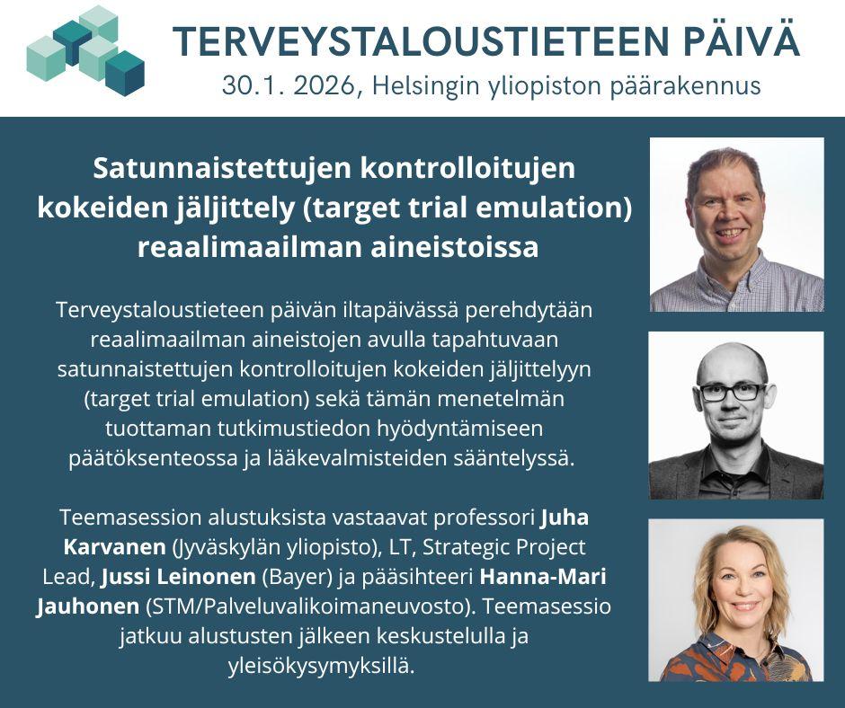 Terveystaloustieteen päivää vietetään jälleen perjantaina 30.1.2026 Helsingin yliopiston päärakennuksessa. Tapahtuman ohjelma on nyt kokonaisuudessaan julkaistu: https://www.ttts.fi/terveystaloustieteenpaiva/ohjelma-2026/