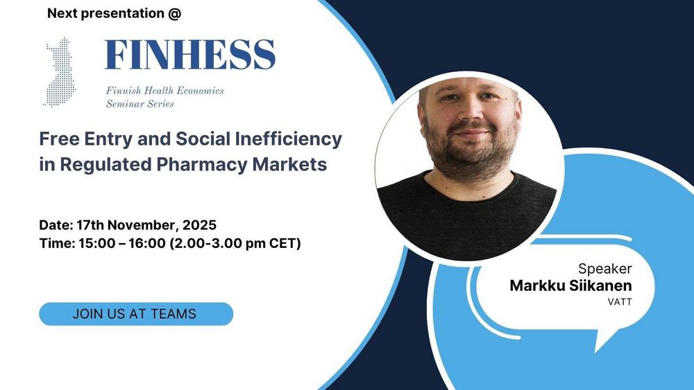The Finnish Health Economics Seminar Series (FINHESS) has been established as a key activity of The Finnish Association of Health and Economics to foster exchange between health economists and social scientists doing research in health-related topics. The series is organized as an online event in Teams once a month and will take place on Mondays, 3:00-4:00pm. The presentations will primarily be held in English. A Scientific Committee chaired by Jaana Kari (JYU), Henri Salokangas (THL), and Markku Siikanen (VATT) will coordinate the series in year 2025.