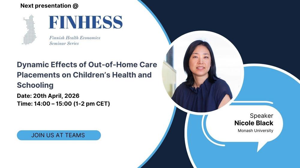 The Finnish Health Economics Seminar Series (FINHESS) has been established as a key activity of The Finnish Association of Health and Economics to foster exchange between health economists and social scientists doing research in health-related topics. The series is organized as an online event in Teams once a month and will take place on Mondays, 3:00-4:00pm. The presentations will primarily be held in English. A Scientific Committee chaired by Jaana Kari (JYU), Henri Salokangas (THL), and Markku Siikanen (VATT) will coordinate the series in year 2026.